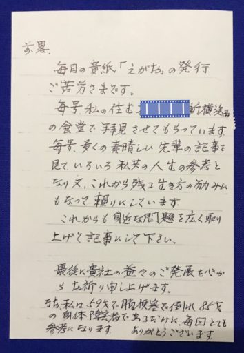 読者の方からの励ましをいただきました! えがお X Facebook はてブ LINE Pinterest コピー 2020.01.06 大人気!フリーペーパーえがおとは Tweet Pocket えがお おはようございます。新年もよろしくお願いいたします。 昨年素敵なお手紙が届きました。 毎月えがおを楽しみにしてくださると言う読者の方です。 このように1人でも笑顔を楽しみにしてくださる方がいる限り一生懸命えがおの発行を継続していきたいと思います。 私が知らない面識もないもちろんお話もしたことのない港北区のプラチナ世代さん。 えがおの紙面を楽しみにしてくださる方が、まだまだたくさんいる事を頭に置きながら取材活動を行って参ります。 皆さんぜひ応援してくださいね。 Tweet Pocket