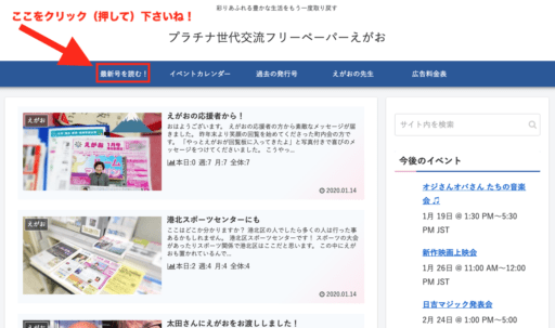 最新号のホームページ更新! えがお X Facebook はてブ LINE Pinterest コピー 2020.01.15 大人気!フリーペーパーえがおとは Tweet Pocket えがお おはようございます。 毎月15日はえがおの発行日です! 本日中にはおもな区役所・ケアプラザ・地区センターなど200箇所には配布済み! 上の絵のようなところの赤い枠(矢印の先)をマウスでクリックするか スマホの人は指先で軽くタッチしてくださいね!(長く押すより軽くタッチが良いです) その先が見えますよ(^^) Tweet Pocket