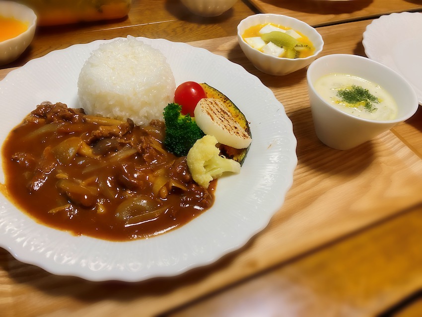 付け合わせには焼き野菜、牛乳カンのフルーツデザートと白菜とコーンのスープです。