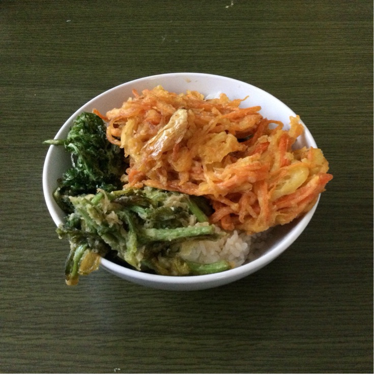 その後一旦戻って揚げておいたかき揚げ丼をいただきました。